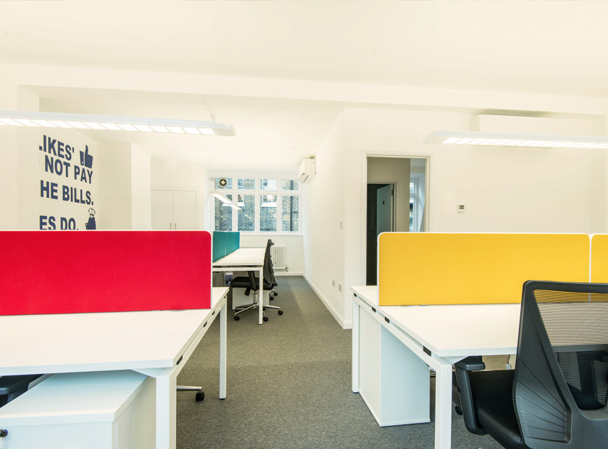Your own desk and pedestal of drawers, in a modern and creative environment with high speed Wi-FI